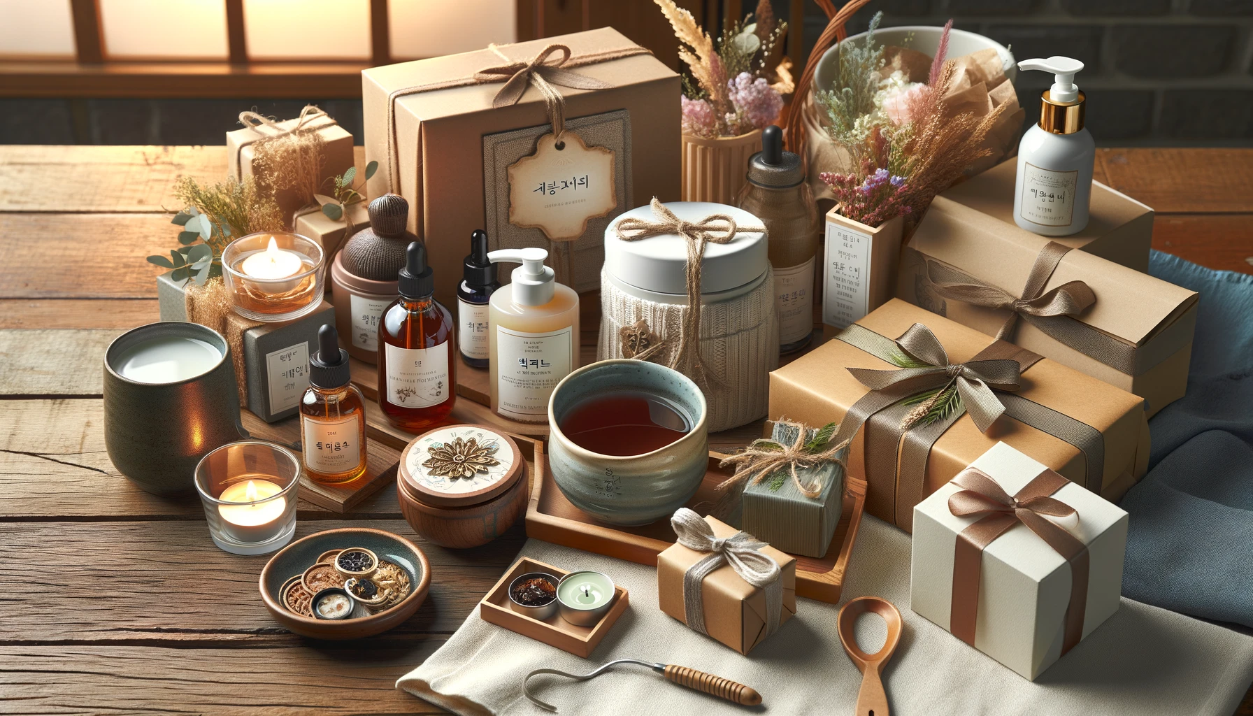 패브릭 보자기 포장이나 손글씨 태그, 말린 꽃 장식 등을 활용해 보세요.